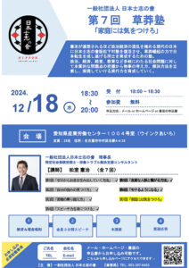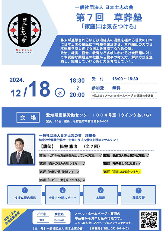 幕末が連想されるほど政治経済の混乱を極める現代の日本に日本士志の會版松下村塾を復活させ、草莽崛起の力で日本転生を成し遂げる同士を育成するための塾。